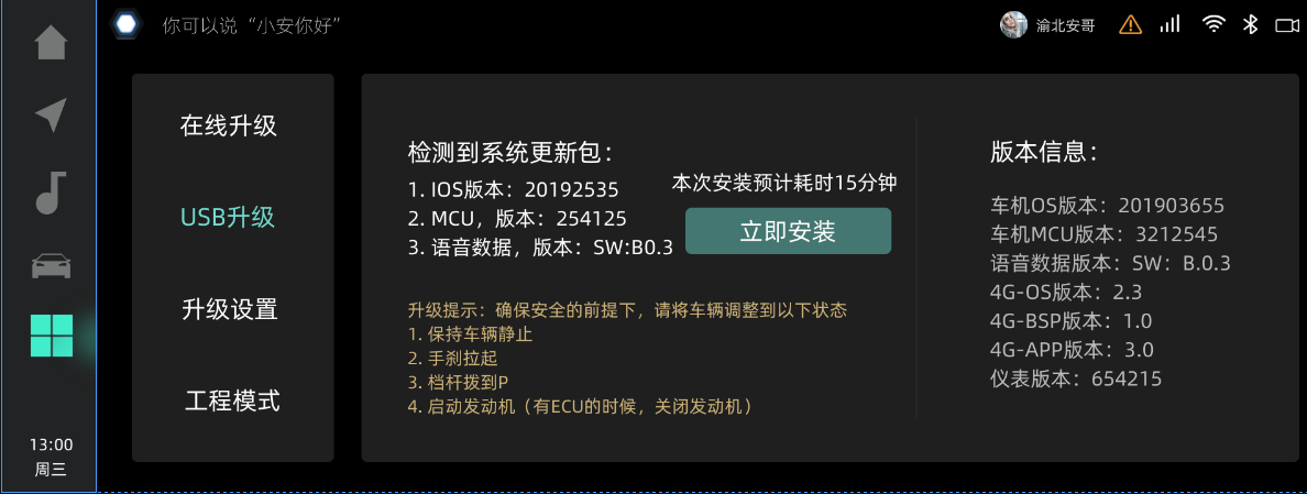 升级过程中切勿断电,建议停好车辆,保证发动机正常运转,避免蓄电池电量过低导致的自动关机。 USB升级时,升级包文件请务必放置在USB设备的根目录下。 进行WLAN升级前,先确保WLAN网络已稳定连接,否则可能下载更新文件失败,导致无法更新。 |