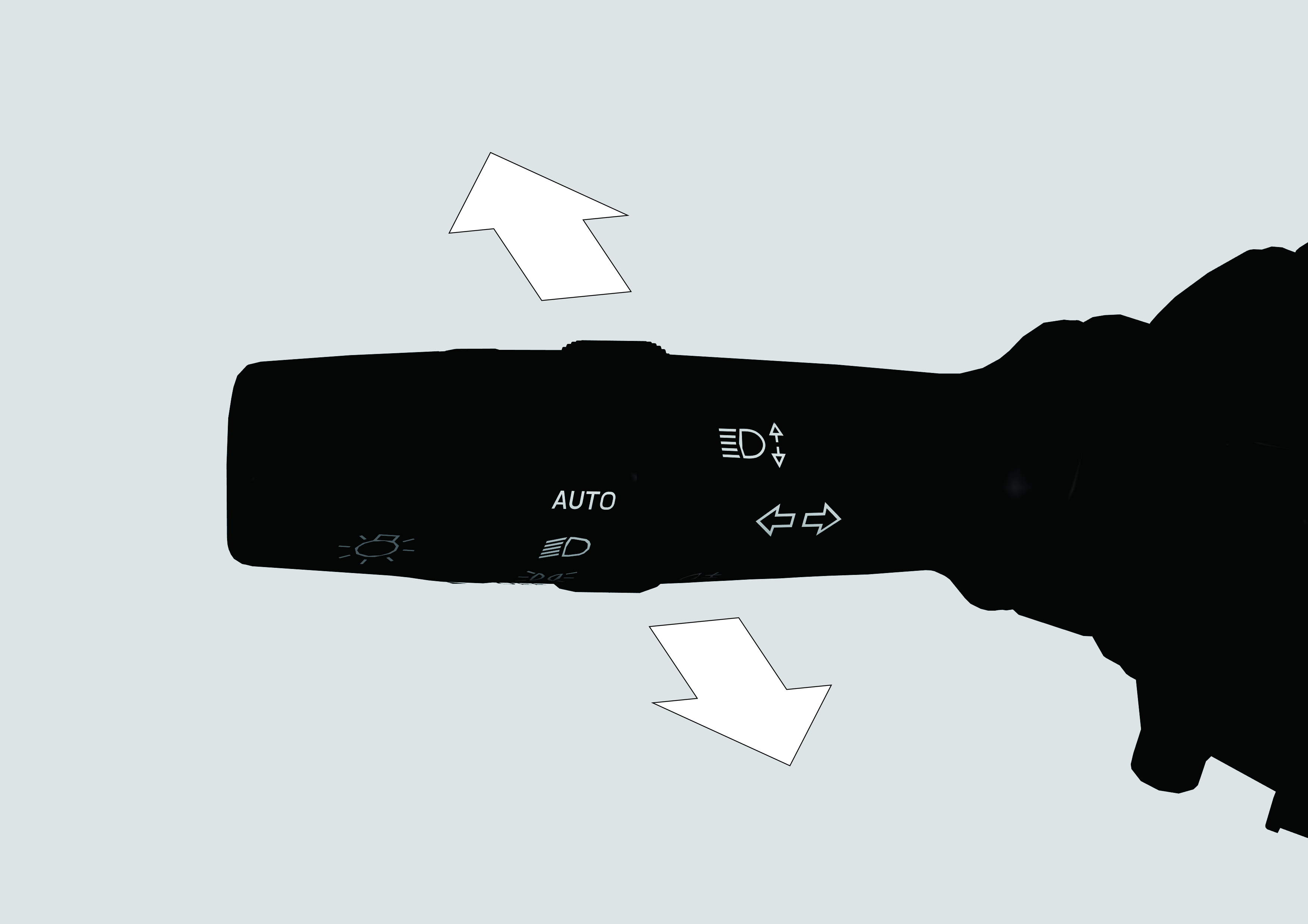 车身姿态随车辆装载状况、加速或减速等情况变化时,可通过此开关调节近光灯光束倾斜度。滚动滚轮开关向上,近光灯灯光角度往上调节;滚动滚轮开关向下,近光灯灯光角度往下调节。
