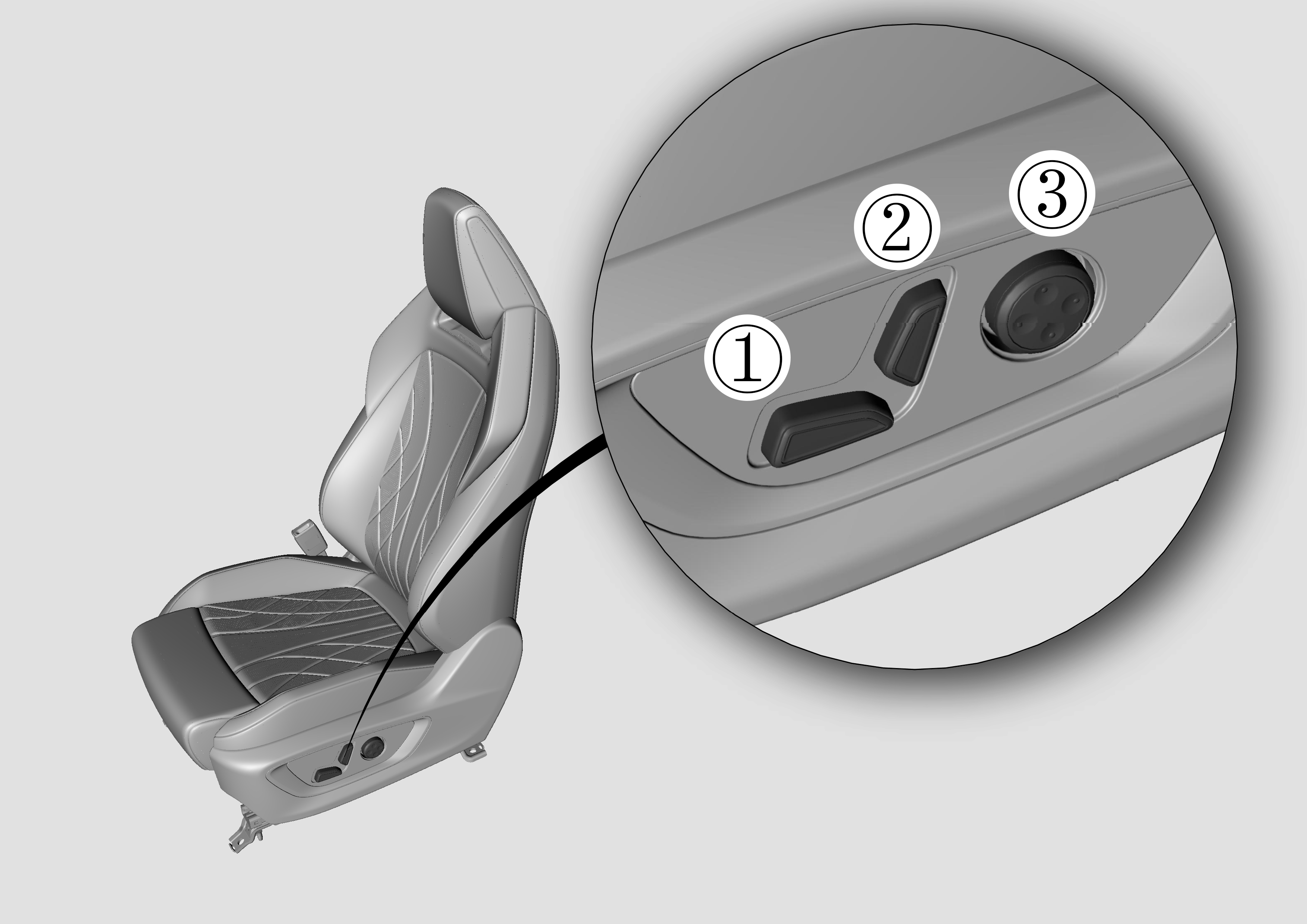 长按开关③的前、后、上、下,座椅腰部支撑随之往前、后、上、下运动,松开即停止运动(只有主驾座椅有腰部支撑调节功能,副驾座椅无此功能)。