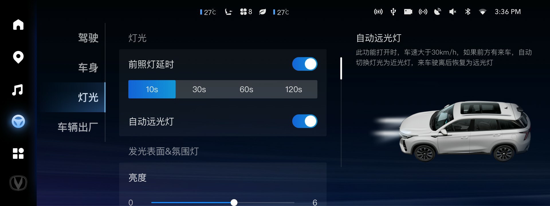 】-【灯光】-【自动远光灯】开启/关闭该功能,仪表上方显示