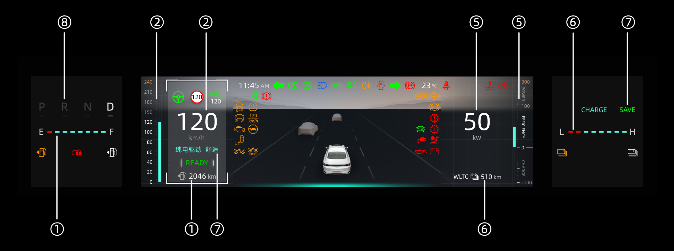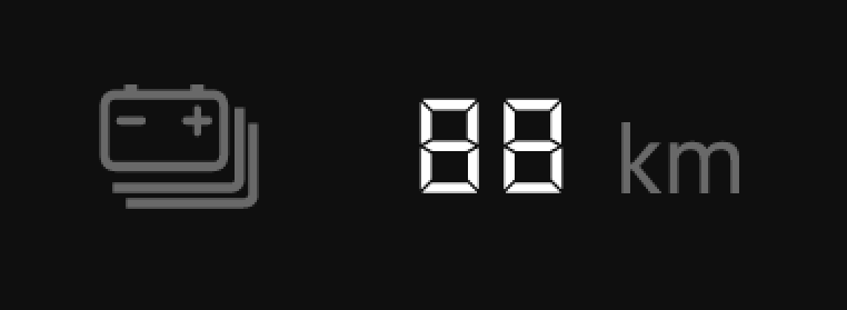 显示车辆剩余电量大约可以行驶的里程。EV 模式下,电量进度条很低时,车辆会自动切换至HEV 模式。