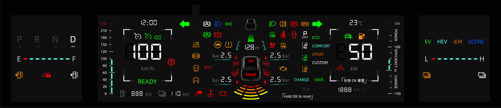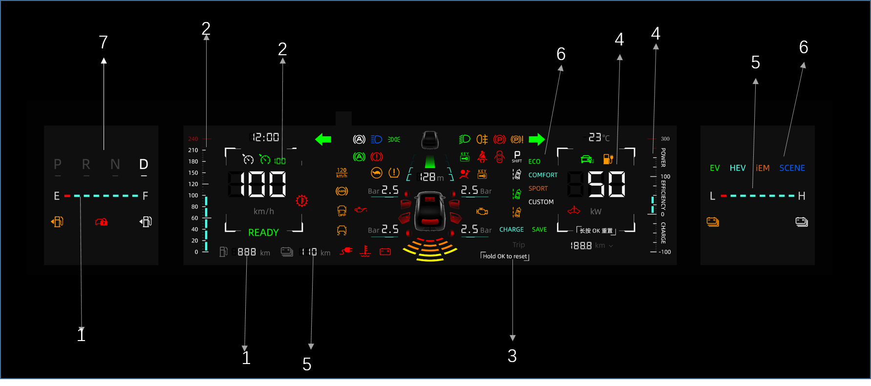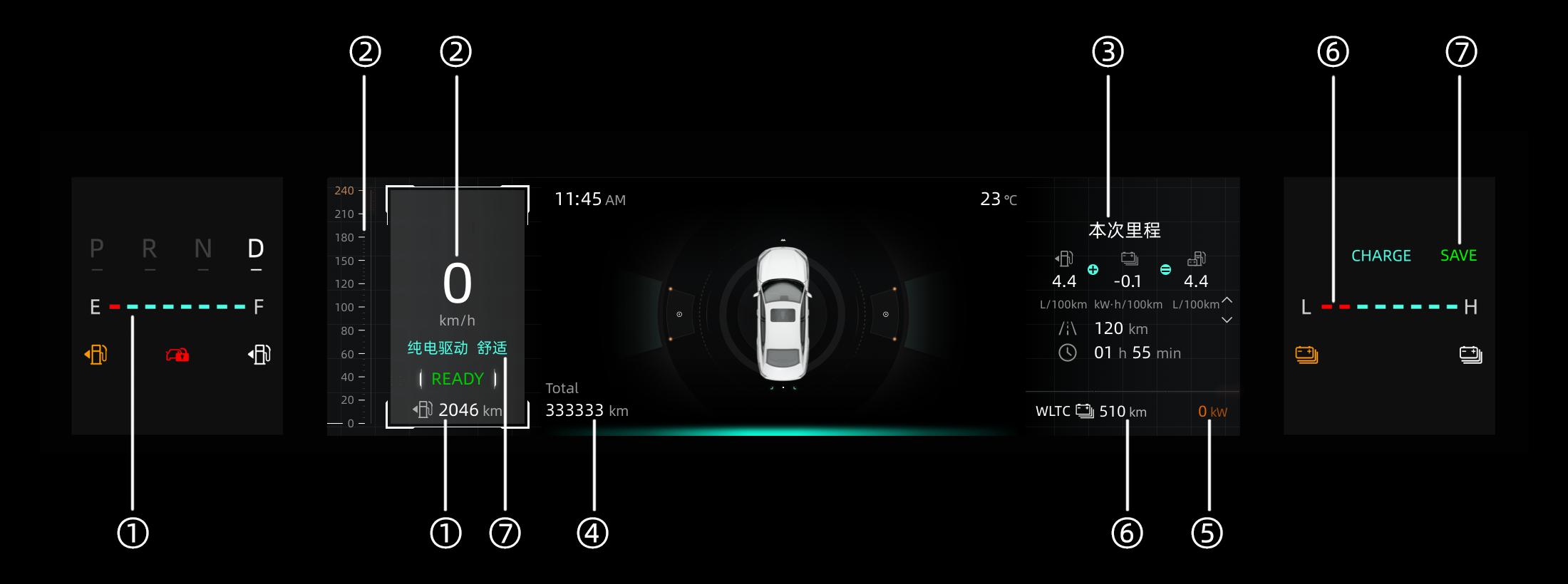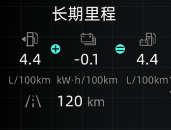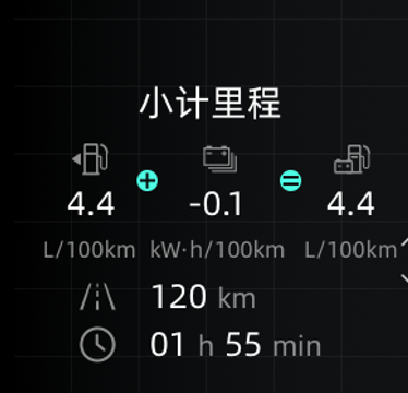 菜单键:切换行驶信息:总里程、小计里程、平均油耗、平均电耗