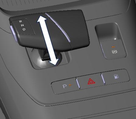 可通过方向盘右侧的怀挡手柄切换为R、N、D档,或通过按压怀挡手柄右侧的P档按键切换为P档。
