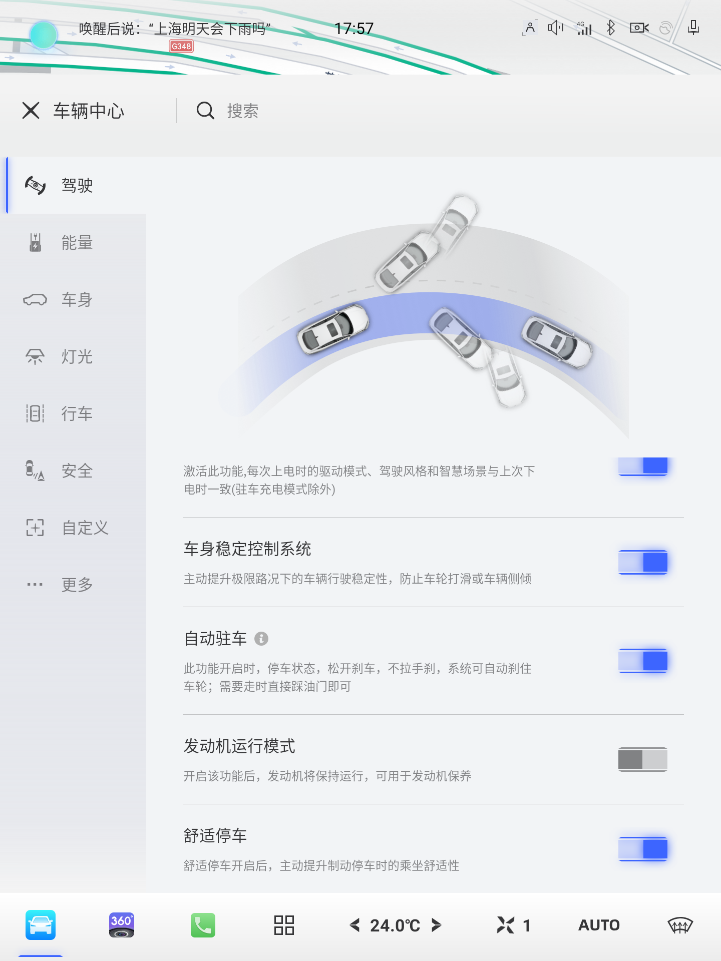 ESC为默认开启状态,您可点击多媒体显示屏【车辆中心】→【驾驶】→【车身稳定控制系统】来开启或关闭此功能。轻按开关,此时,仪表上ESC_OFF指示灯