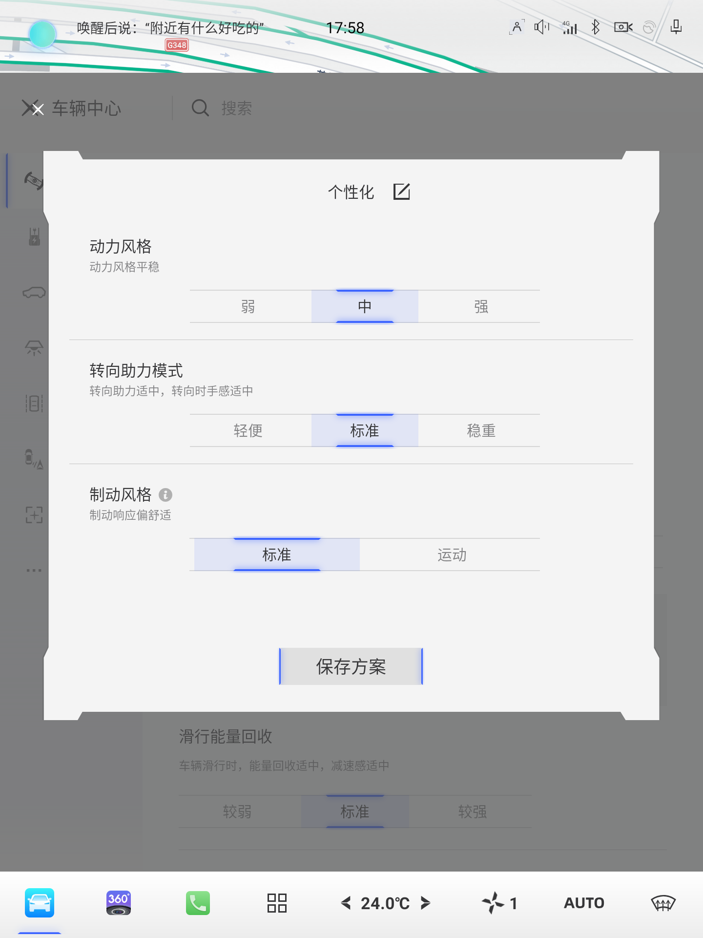 集成制动控制模块可实现两种不同的制动踏板感模式切换:标准和运动。节能/舒适驾驶模式默认与标准踏板感模式关联,运动驾驶模式默认与运动踏板感模式关联。用户可在自定义模式中根据自我喜好进行设置。 分别与点击显示屏【车辆中心】-【驾驶】-【驱动模式】-【纯电模式/混动模式】-【个性化】-【制动风格】完成模式切换。
