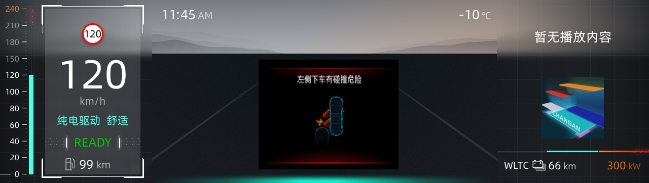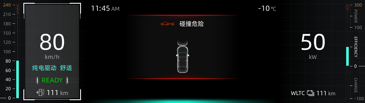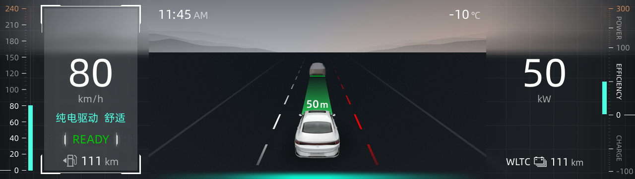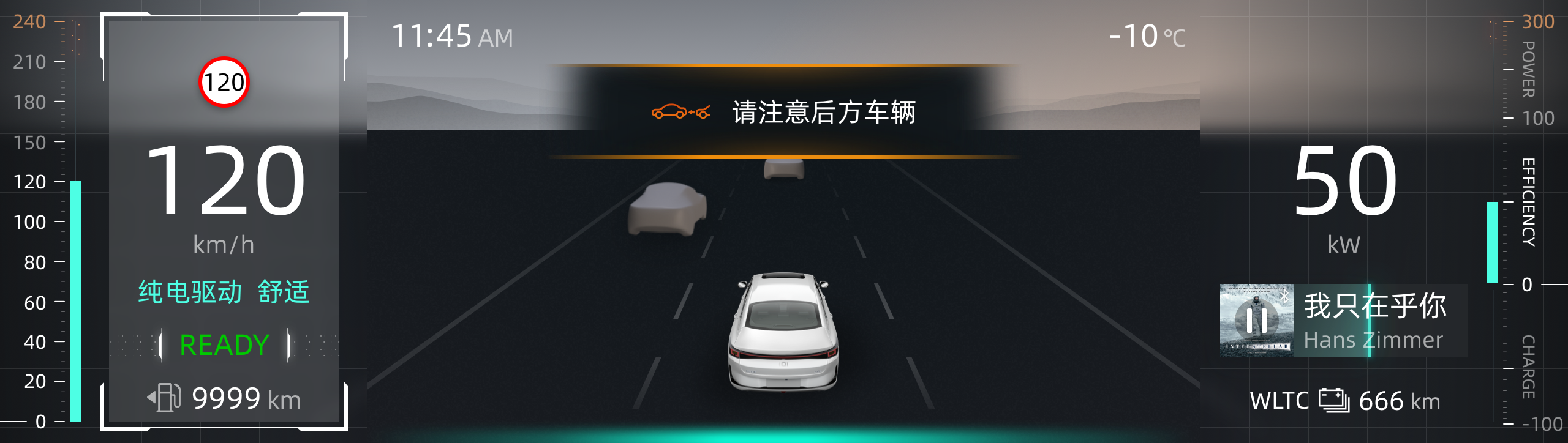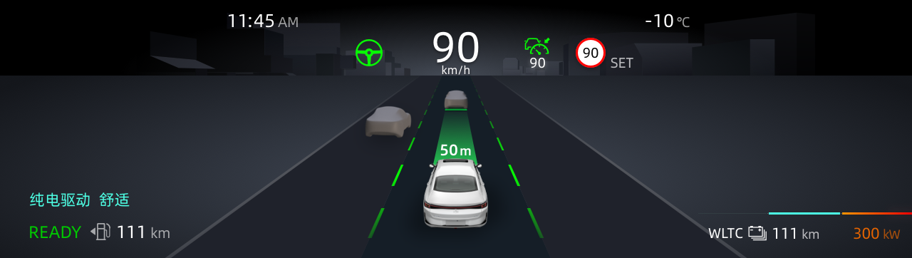 若传感器识别到两侧车道标线,则车道标线被白色填充(识别到一侧车道线则填充一侧,两侧均未识别到则都为灰色)。