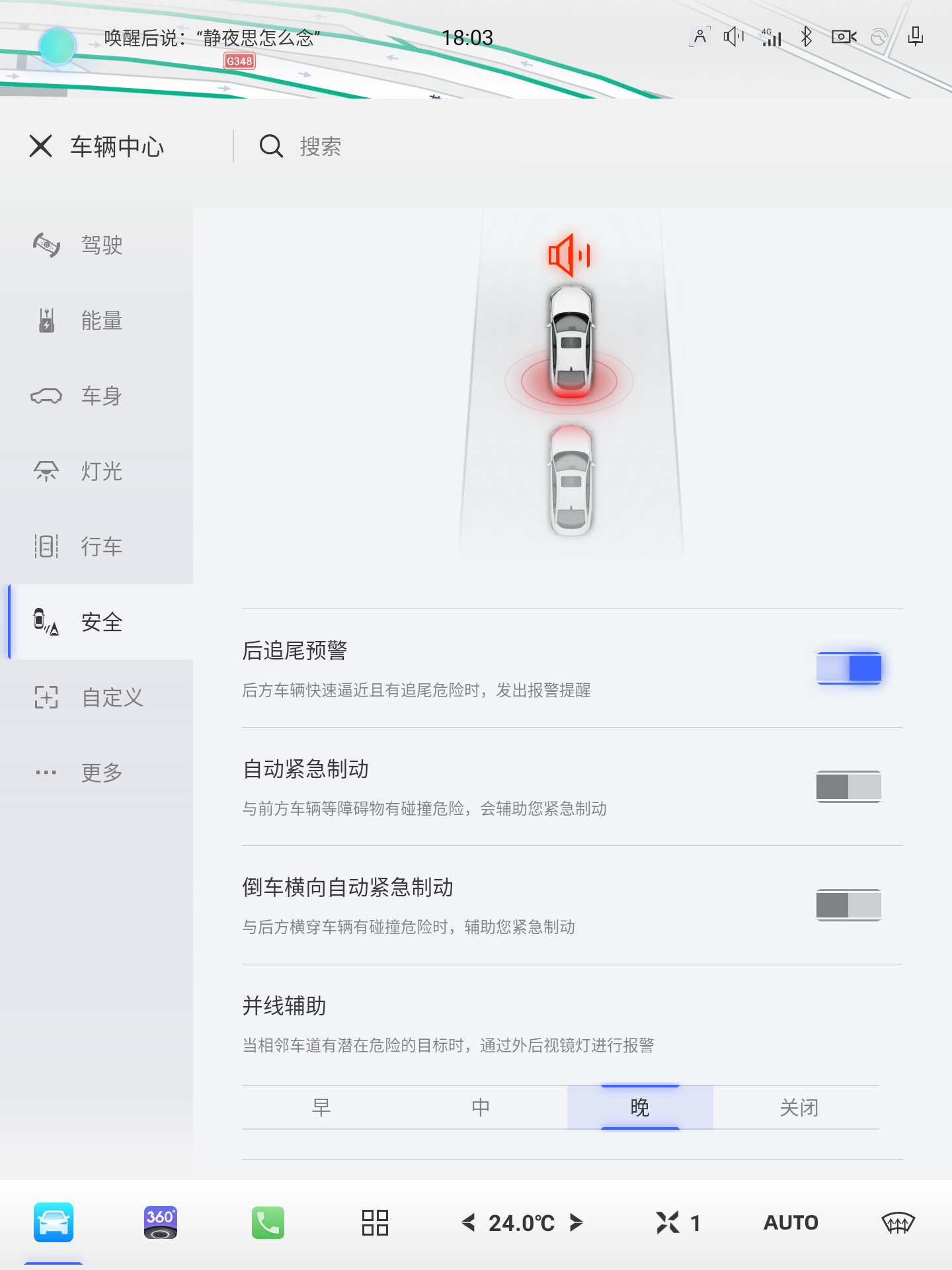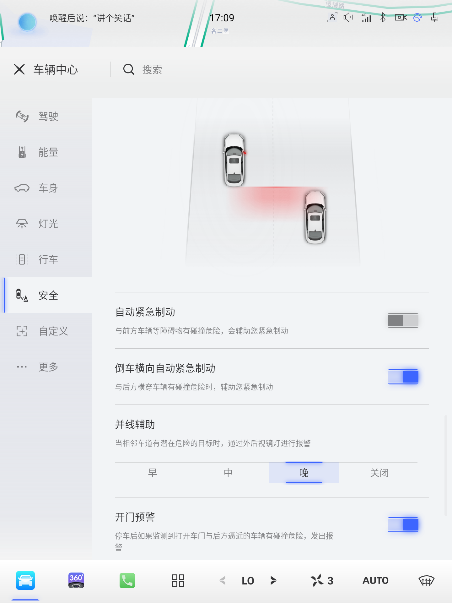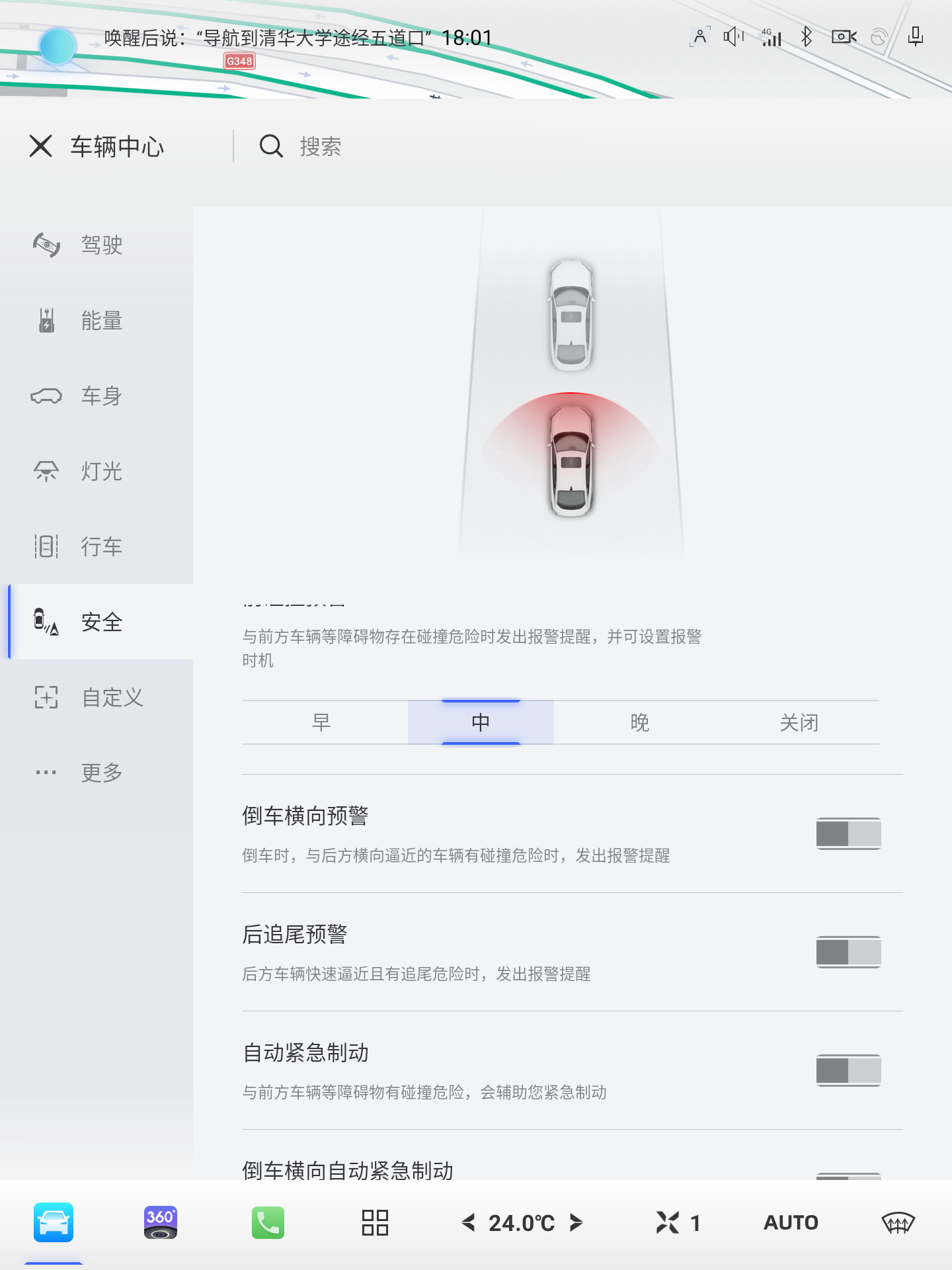 点击显示屏【车辆中心】-【安全】界面开启/关闭【前碰撞预警】和【自动紧急制动】两个功能。