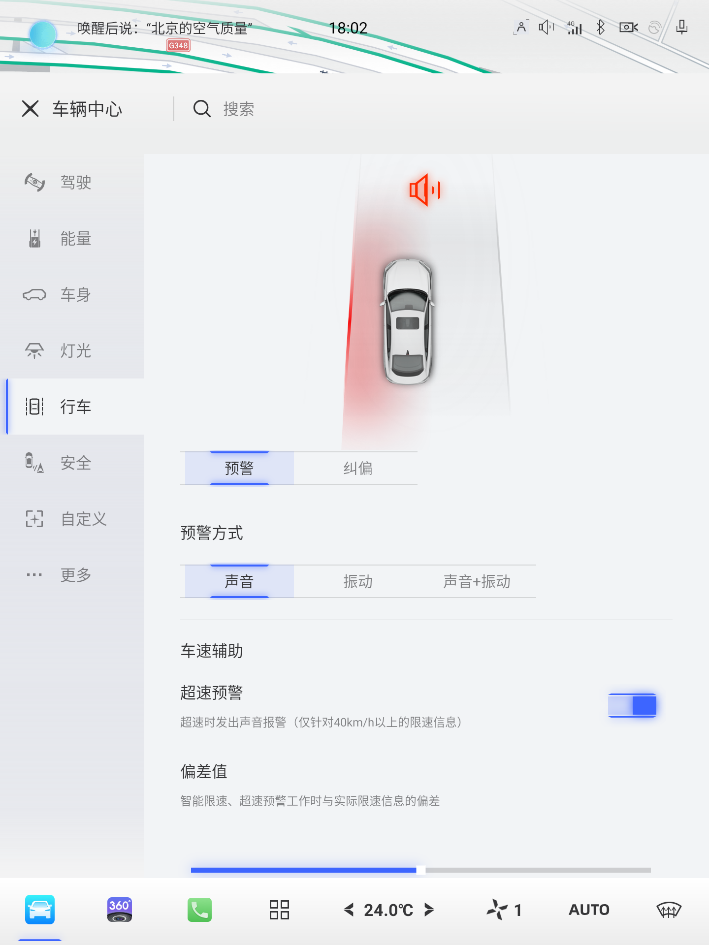 可在显示屏主页面【车辆中心】-【行车】-【车道偏离辅助】中选择【预警方式】: