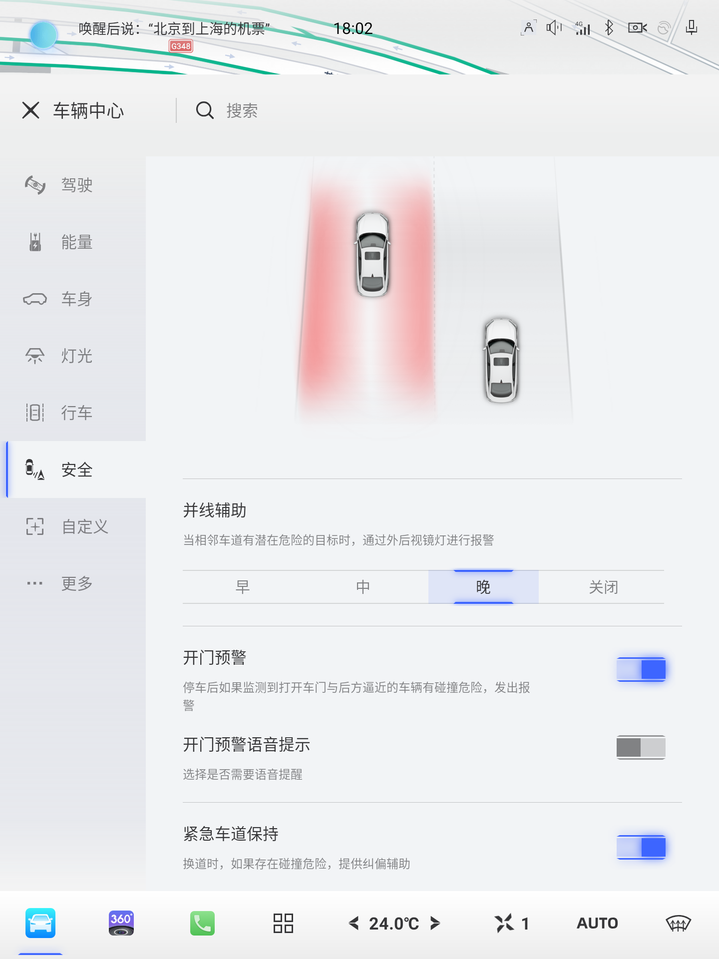整车电源处于ON挡时,点击【车辆中心】-【安全】开启或关闭“紧急车道保持”功能。