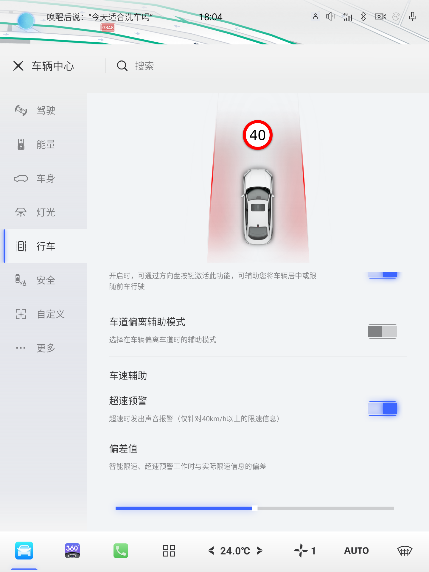 整车电源处于ON挡时,系统默认开启。同时在显示屏主页面“车辆中心”-“行车辅助”-“超速预警”可以设置偏差值(±10km/h范围内)、开启/关闭超速预警提示音。