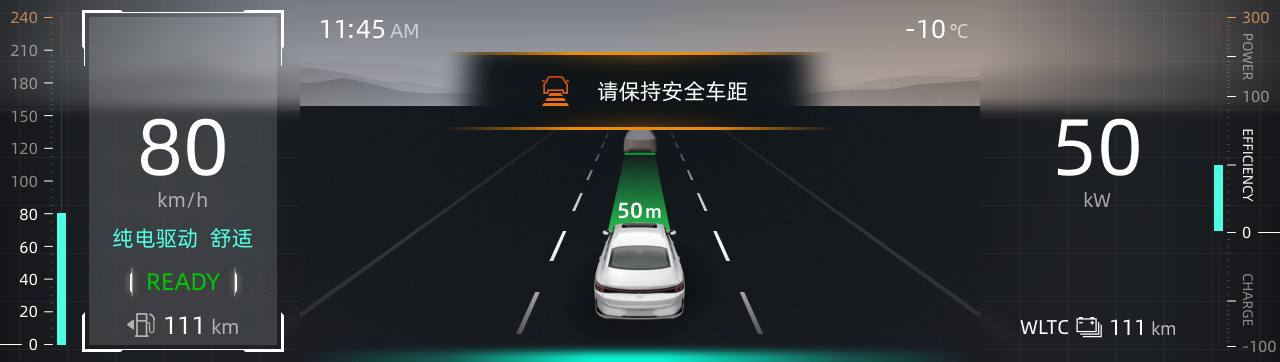 当长时间跟车距离过近时,仪表会提示“请保持安全车距”,该报警在本车车速(60-150km/h)时仅对运动车辆起作用。