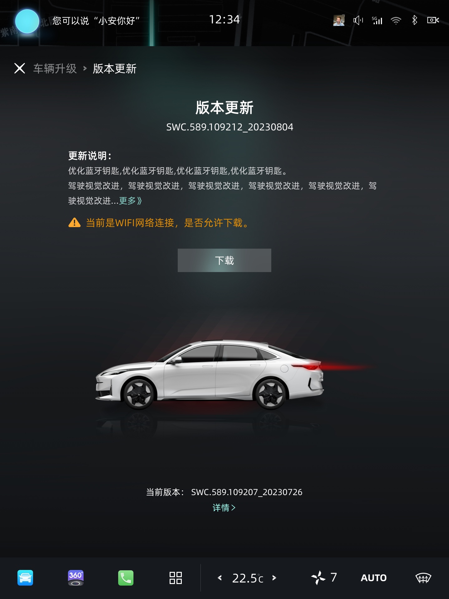 若系统有更新, 在车辆连接 WIFI 网络(手机热点)的状态下,会提示以下界面: