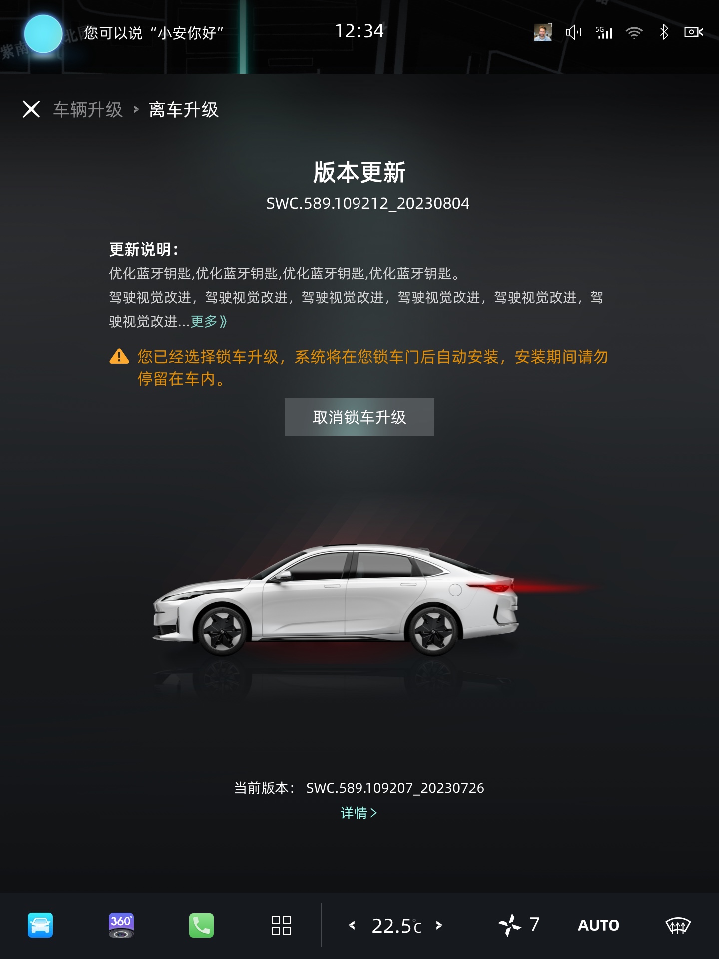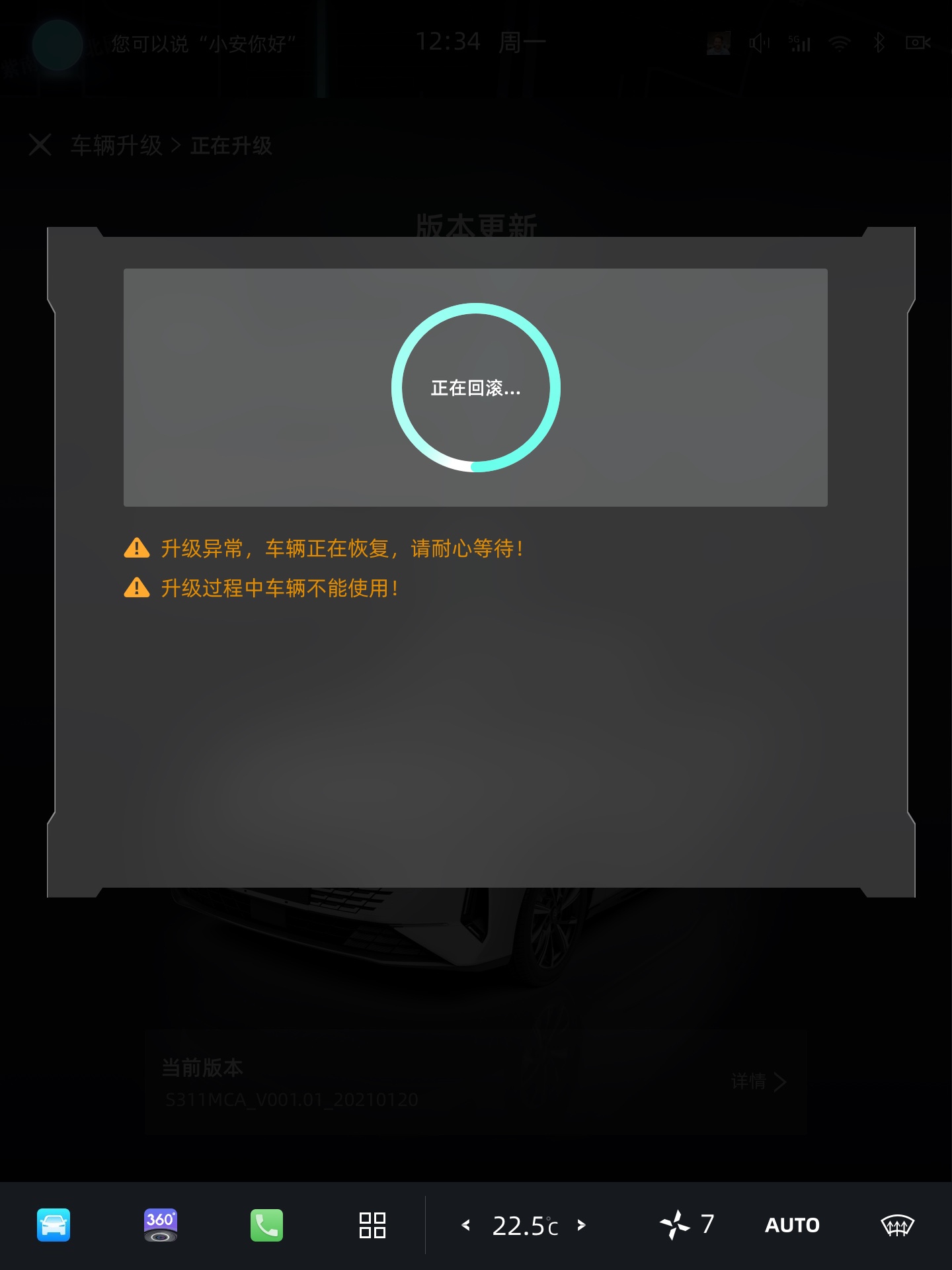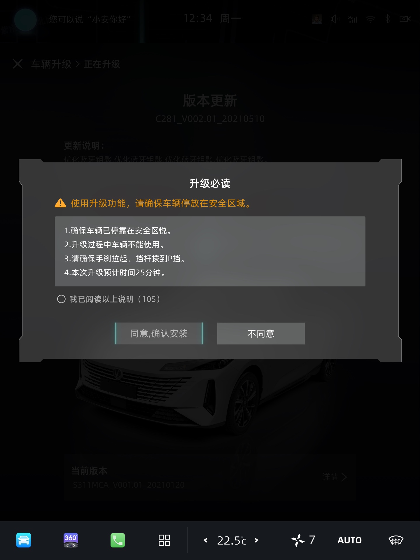满足升级条件后,开始安装流程,此时车辆的软件处于更新中,请保持车辆安全,不能启动和驾驶车辆,不能操作换挡杆和手刹: