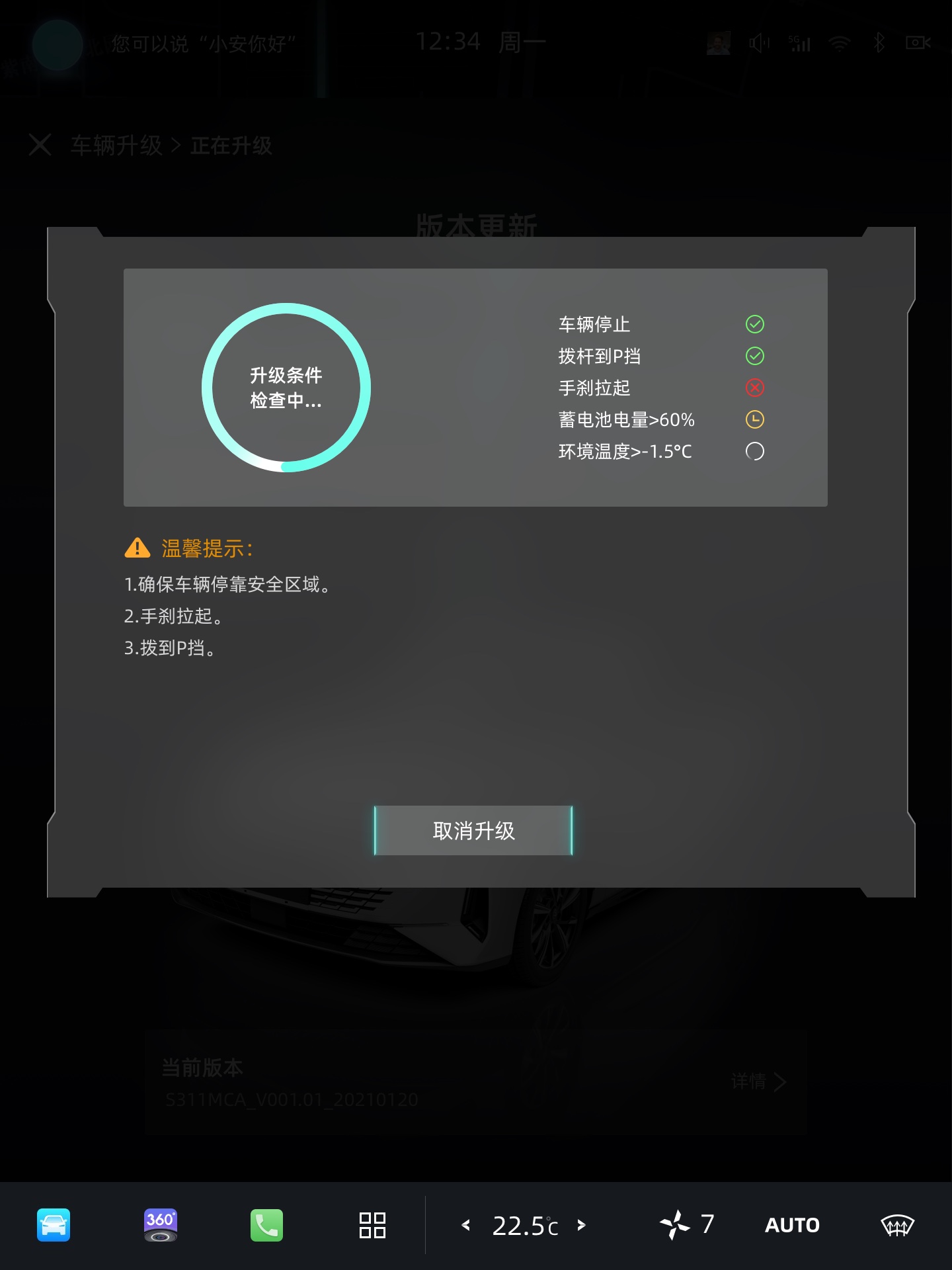 点击同意后,系统会进行条件检测,查看当前车辆状态是否满足升级条件。此过程可以选择“取消升级”退出当前页面: