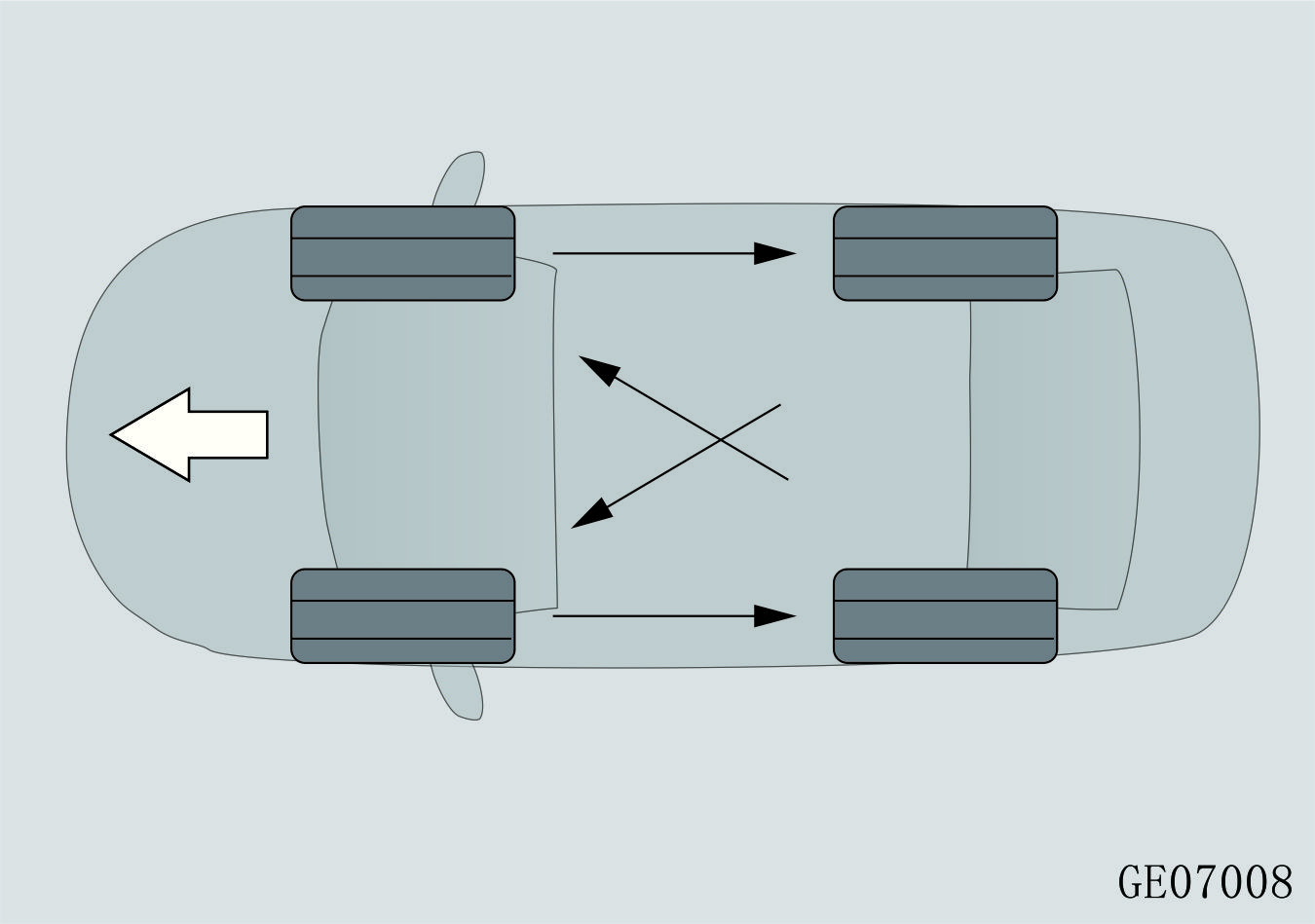为确保车辆前后轮轮胎磨损均匀并延长其使用寿命,建议首保后,每行驶7500km时进行轮胎换位,换位规则参照图示。若发现不规则磨损,则应提早换位。