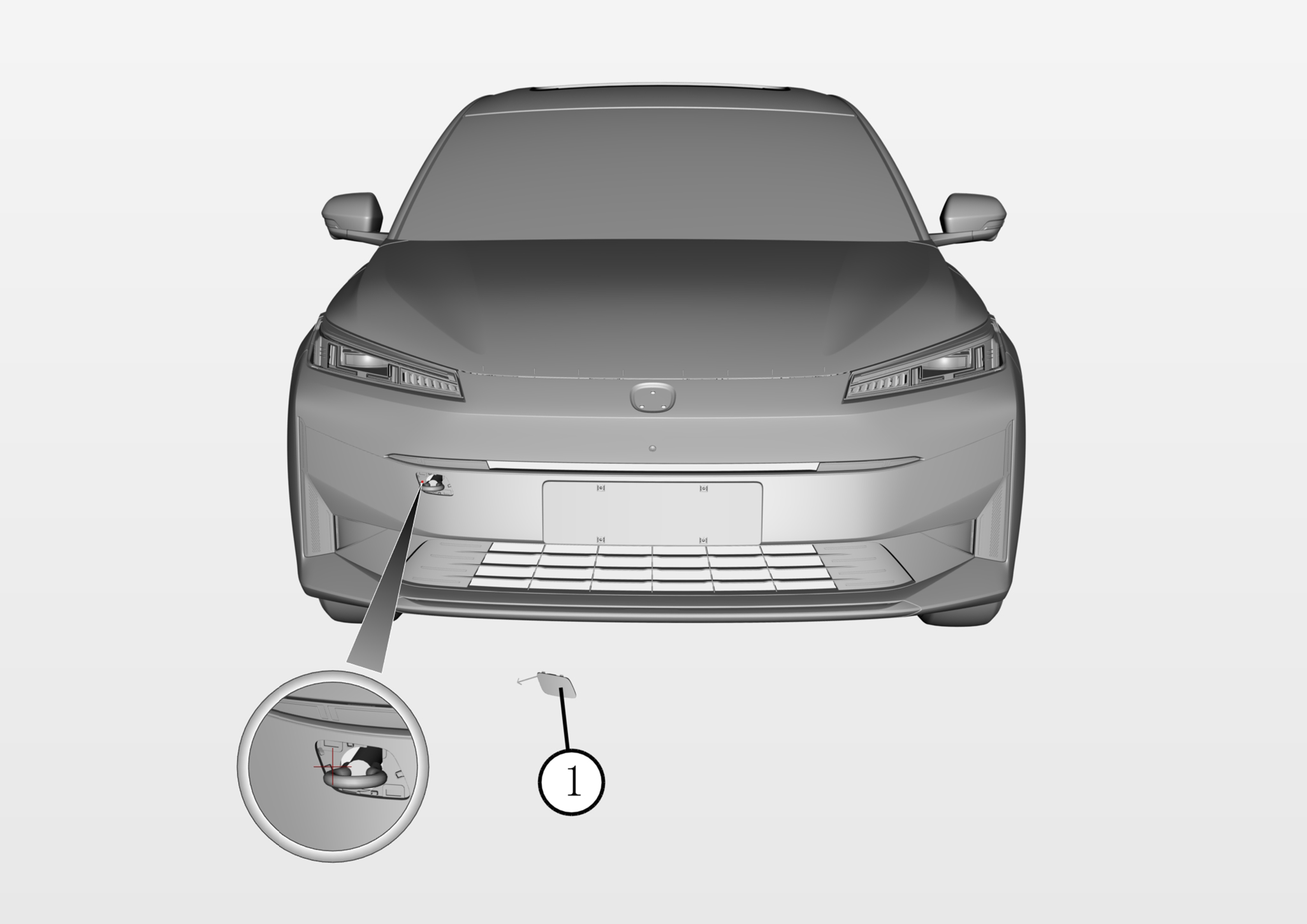 撬开前保险杠拖钩安装盖①,打开盖板,将前拖钩螺纹完全拧进脱钩管即可。首次使用由于电泳漆的影响,可能需要较大的拧紧力。前拖钩安装位置位于前保险杠右侧下方前碰撞横梁总成上。