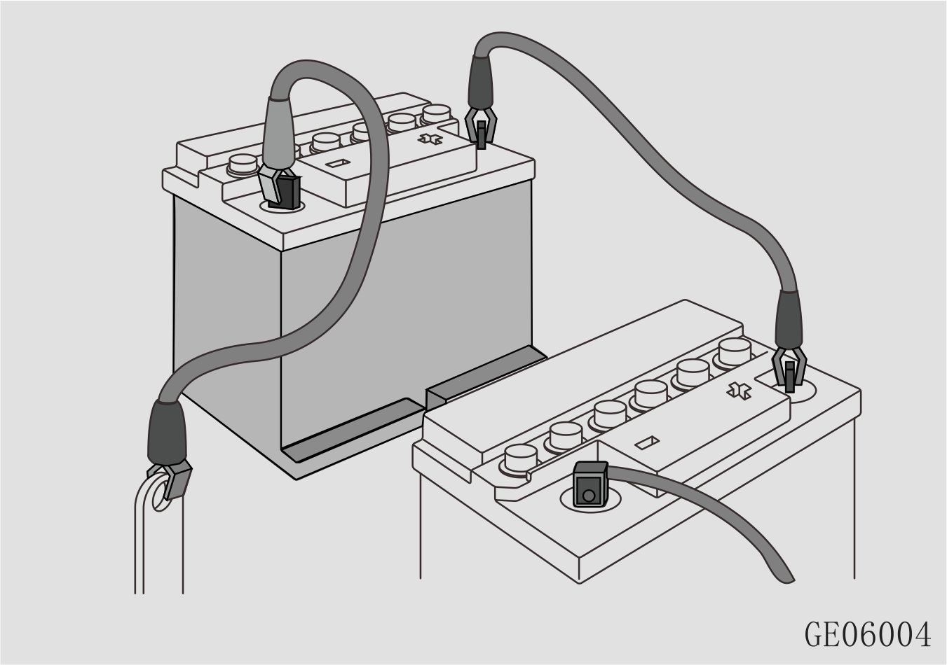 搭接线连接方式:用一根电缆将供电蓄电池和亏电蓄电池的正极连接,另一根电缆接在供电蓄电池的负极和亏电车的车身负极搭铁处,远离蓄电池和燃油喷射系统。