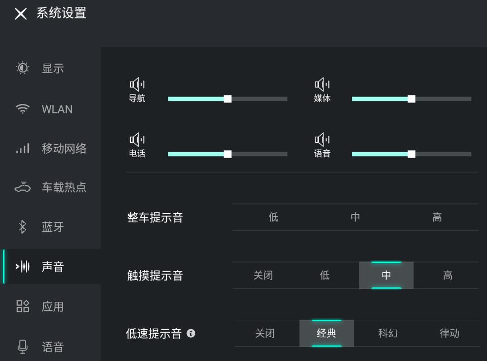 点击车机屏幕【系统设置】-【声音】-【低速提示音】开启/关闭该功能,或随喜好选择不同的音效。