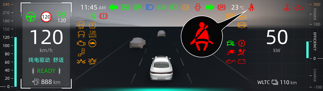 此时如果你仍不系安全带,一段时间后警告音自动关闭,指示灯图标常亮。