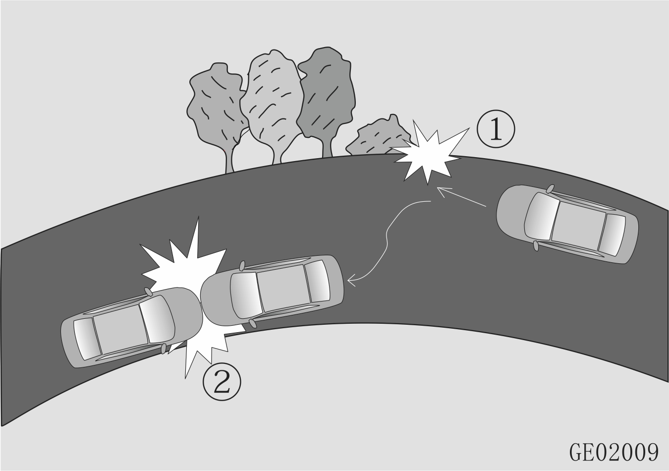 在单车连续性事故中,安全气囊只在车辆第一次达到起爆条件时才展开。车辆发生连续碰撞时,在较轻事故时(①)气囊可能因碰撞程度较轻微或强度不够而不会展开,而在后续再次发生强烈撞击时(②),气囊可能因车辆撞击强度已达到气囊展开标准而工作。