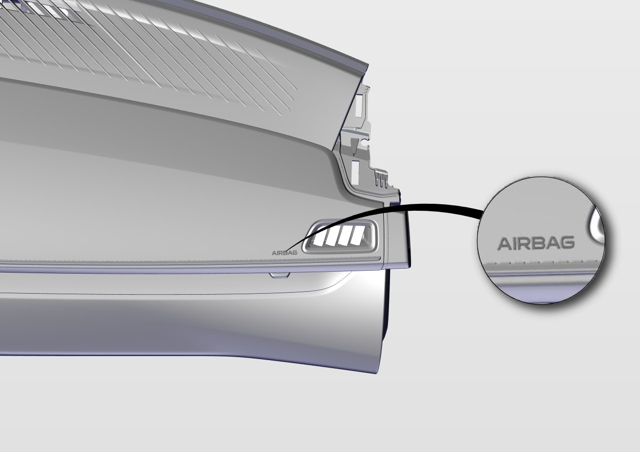 副驾驶员安全气囊安装在手套箱上方的仪表板内,安全气囊的盖板上刻有 “AIR BAG”标识,发生正面碰撞并达到展开条件时展开。