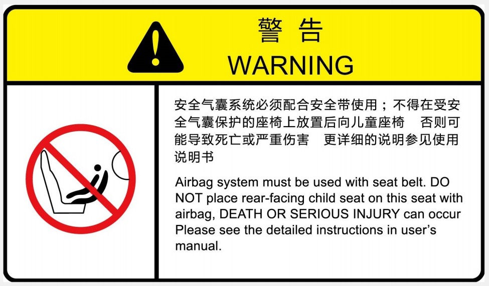 不得在受正面安全气囊保护下的座位上使用后向儿童约束系统。