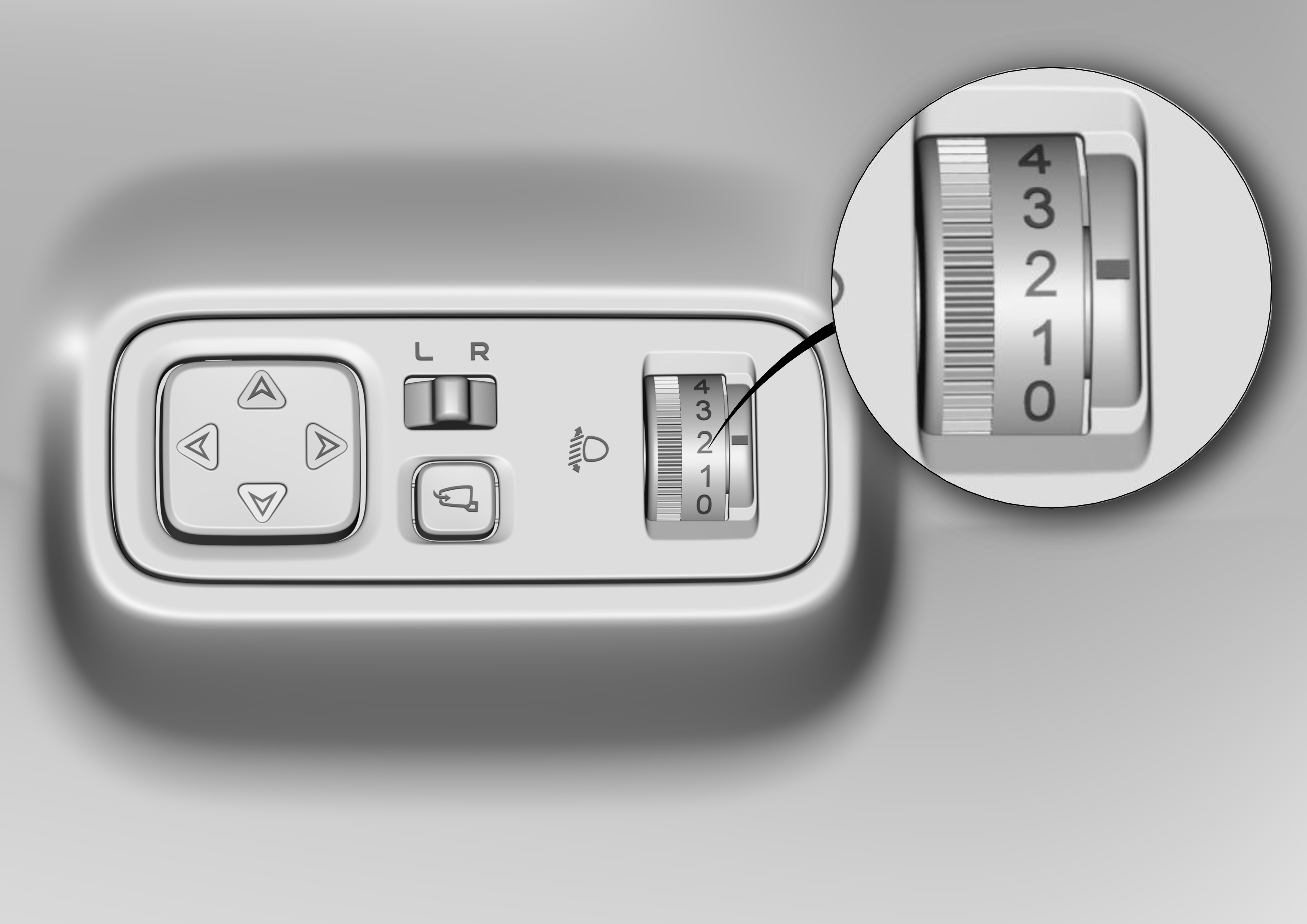 车身姿态随车辆装载状况、加速或减速等情况变化时,可通过此开关调节近光灯光束倾斜度。上拨,近光灯灯光角度往上调节(→0,近光照射最远);下拨,近光灯灯光角度往下调节(→4,近光照射最近)。