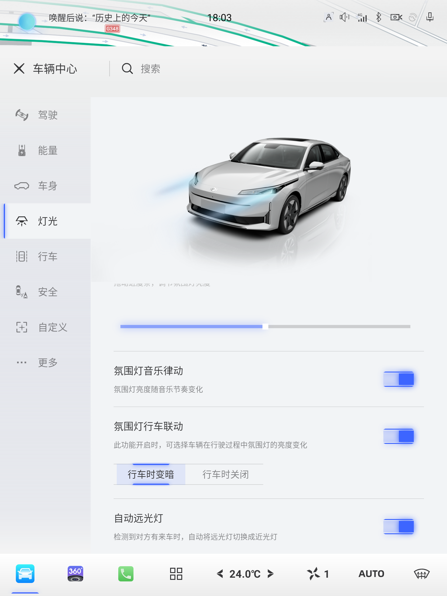 在显示屏主页面【车辆中心】→【灯光】→【自动远光灯】开启、关闭该功能。
